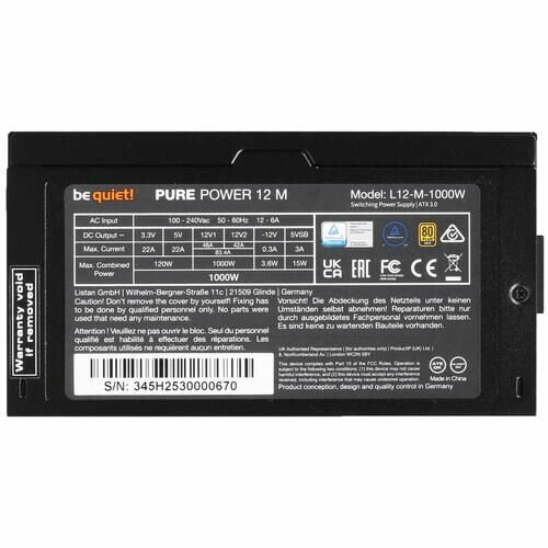 be quiet! Pure Power 12 M 1000W / ATX 3.0, 80 PLUS Gold, LLC+SR+DC-DC, 120mm fan, semi-modular / BN345