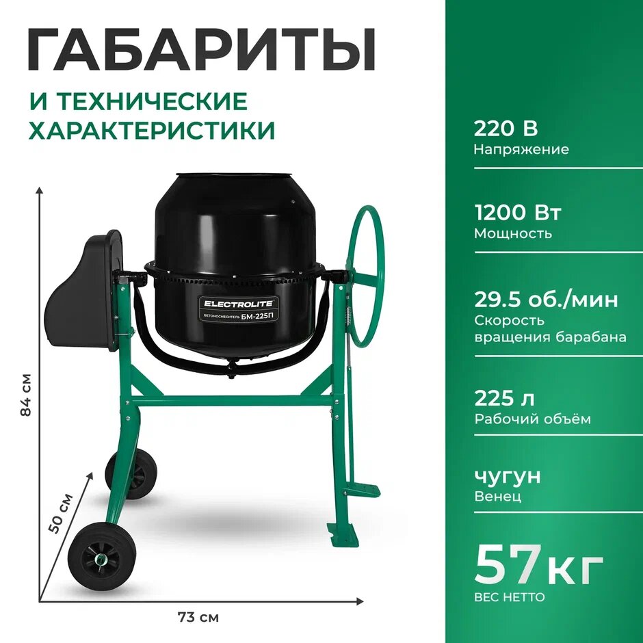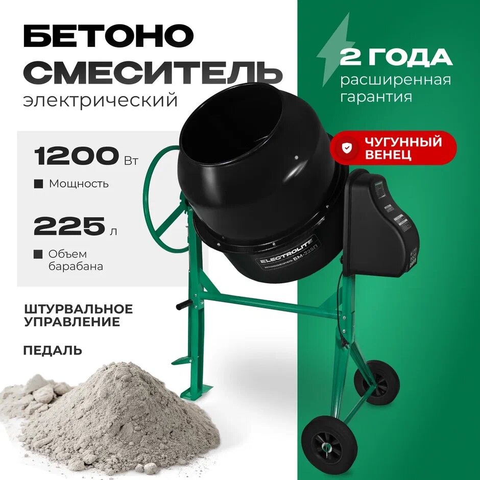 Бетоносмеситель строительный / Гравитационная бетономешалка электрическая Electrolite БМ-225П (1200 Вт, 225 л, педаль, чугунный венец) интересное: