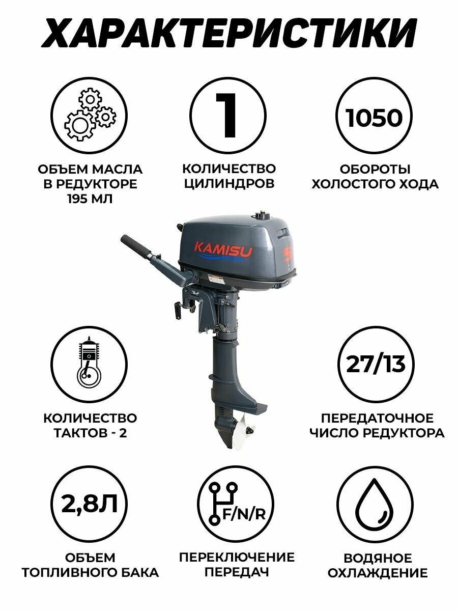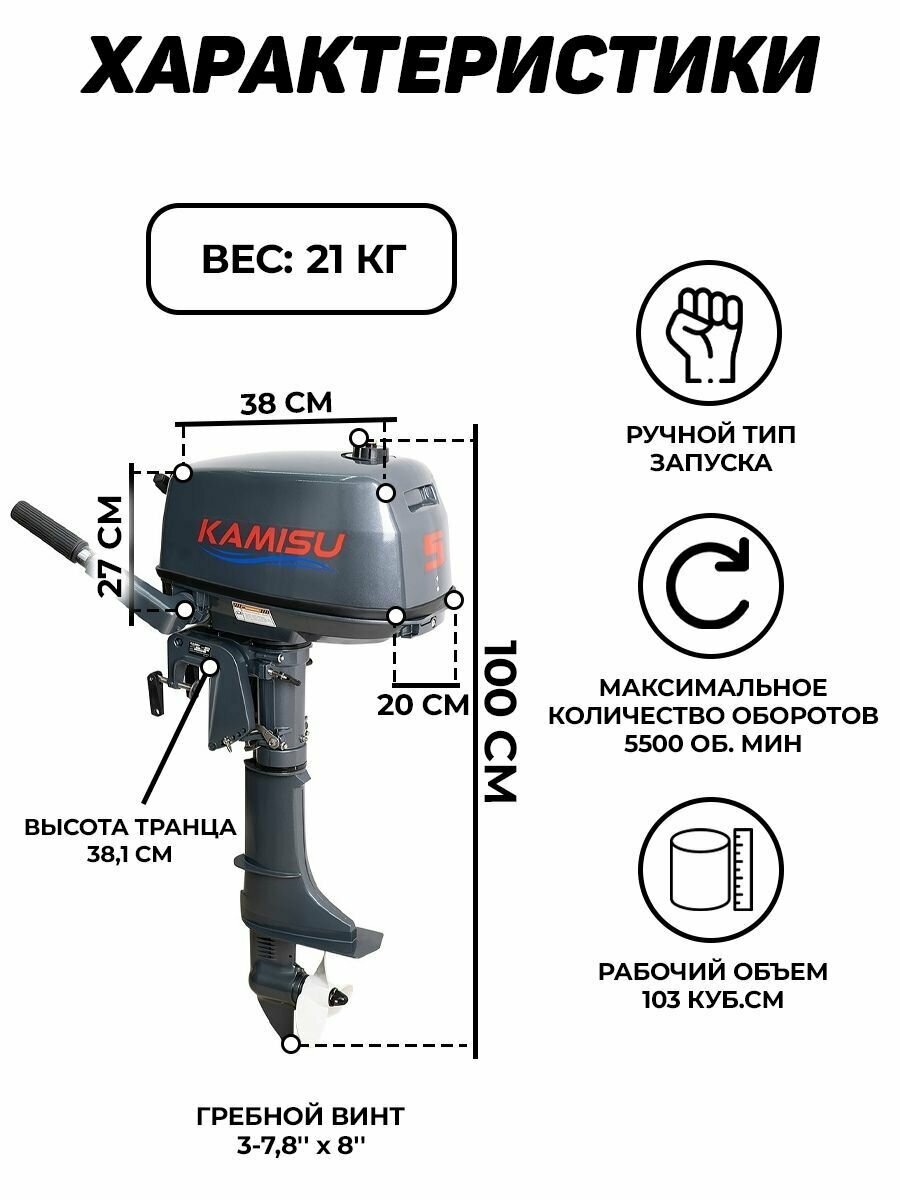 Лодочный мотор KAMISU T5BMS, бензиновый, 5 л.с., 103 куб.см, 2 тактный, 3,7 кВт