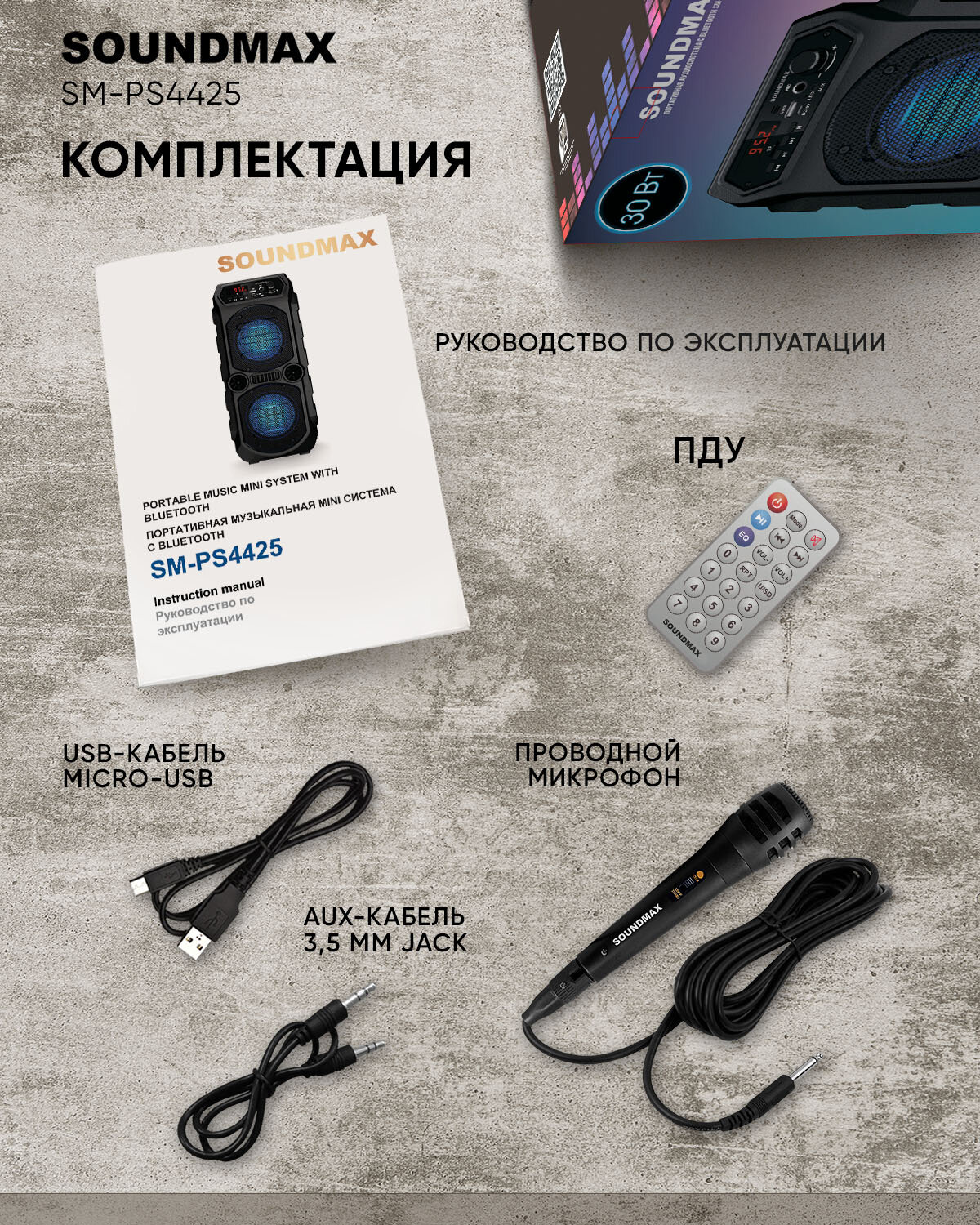 SOUNDMAX Портативная караоке система Soundmax SM-PS4425, 30 Вт, 1200 мАч, BT,SD, AUX, USB,подсветка