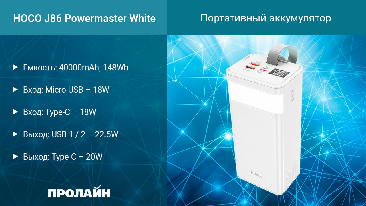 Внешний аккумулятор HOCO J86 Power Master, 40000 mAh, 22.5W, LED дисплей, Лампа, Белый