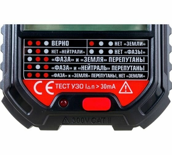 Цветовая индикация для быстрой проверки Показывает напряжение Тест УЗО на 30мА Определяет слабое крепление нуля |