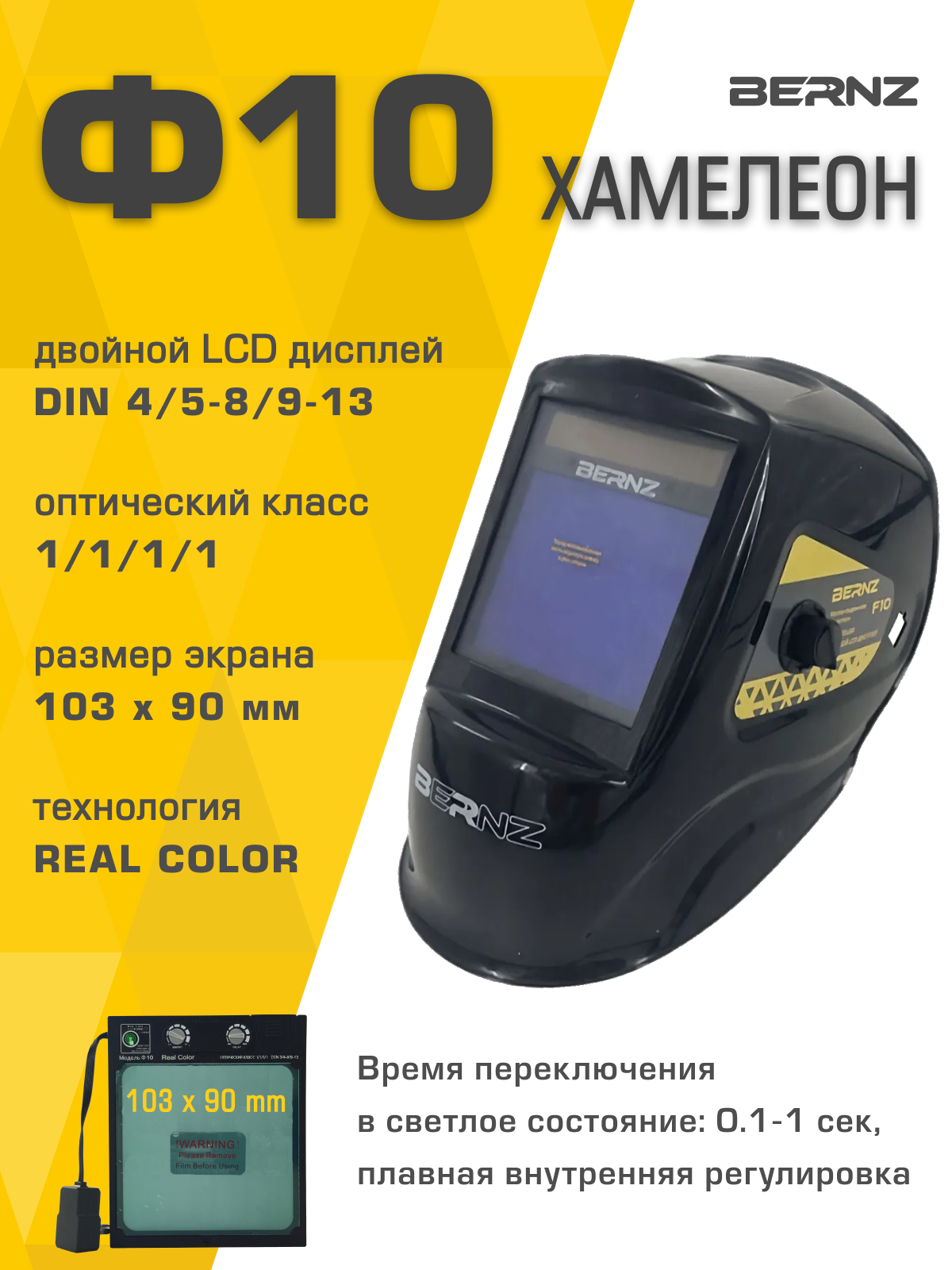 Маска сварщика BERNZ Ф10, Хамелеон 103х90 мм, DIN 4/5-8/9-13, внешняя регулировка, в коробке интересное: