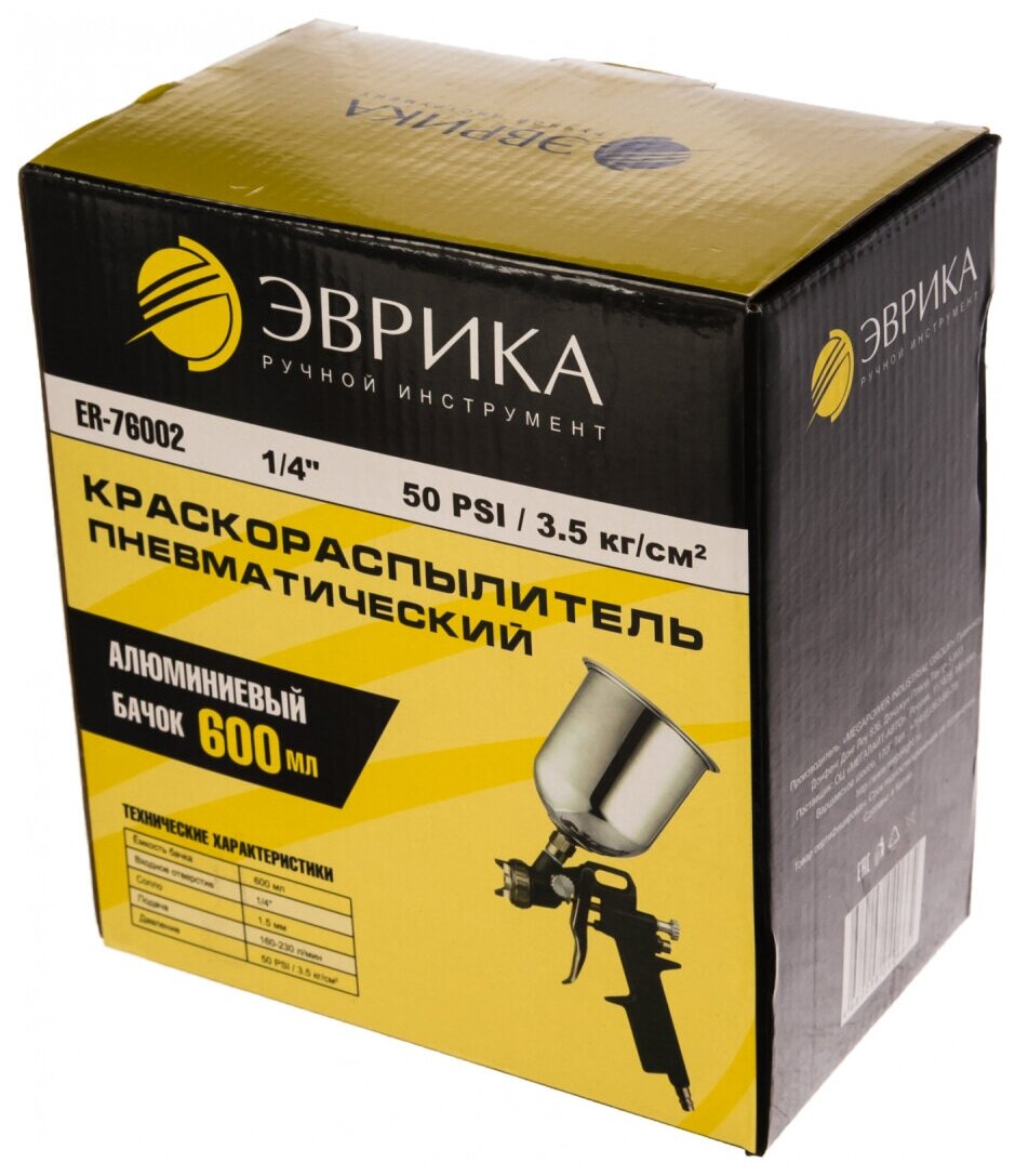 Краскораспылитель ER-76002 пневматический с верхним алюминиевым бачком 600мл (входное отверстие 1/4, сопло 1.5мм., подача 160-230 мл/мин., давление 50PSI/ 3,5кг/см2) эврика