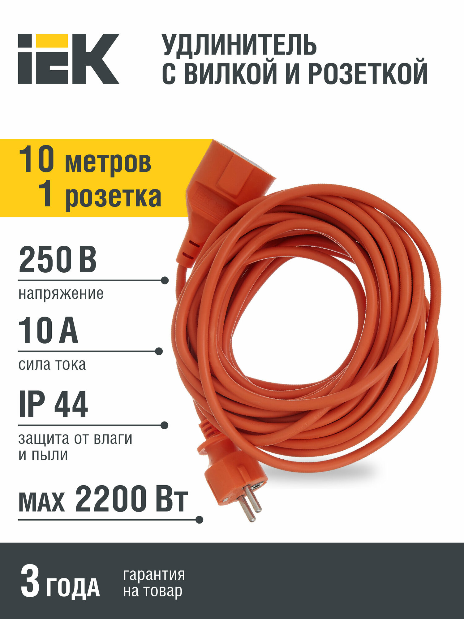 Удлинитель защищенный iEK 1 розетка с заземлением, IP20, 3 x 1 мм, 10 метров