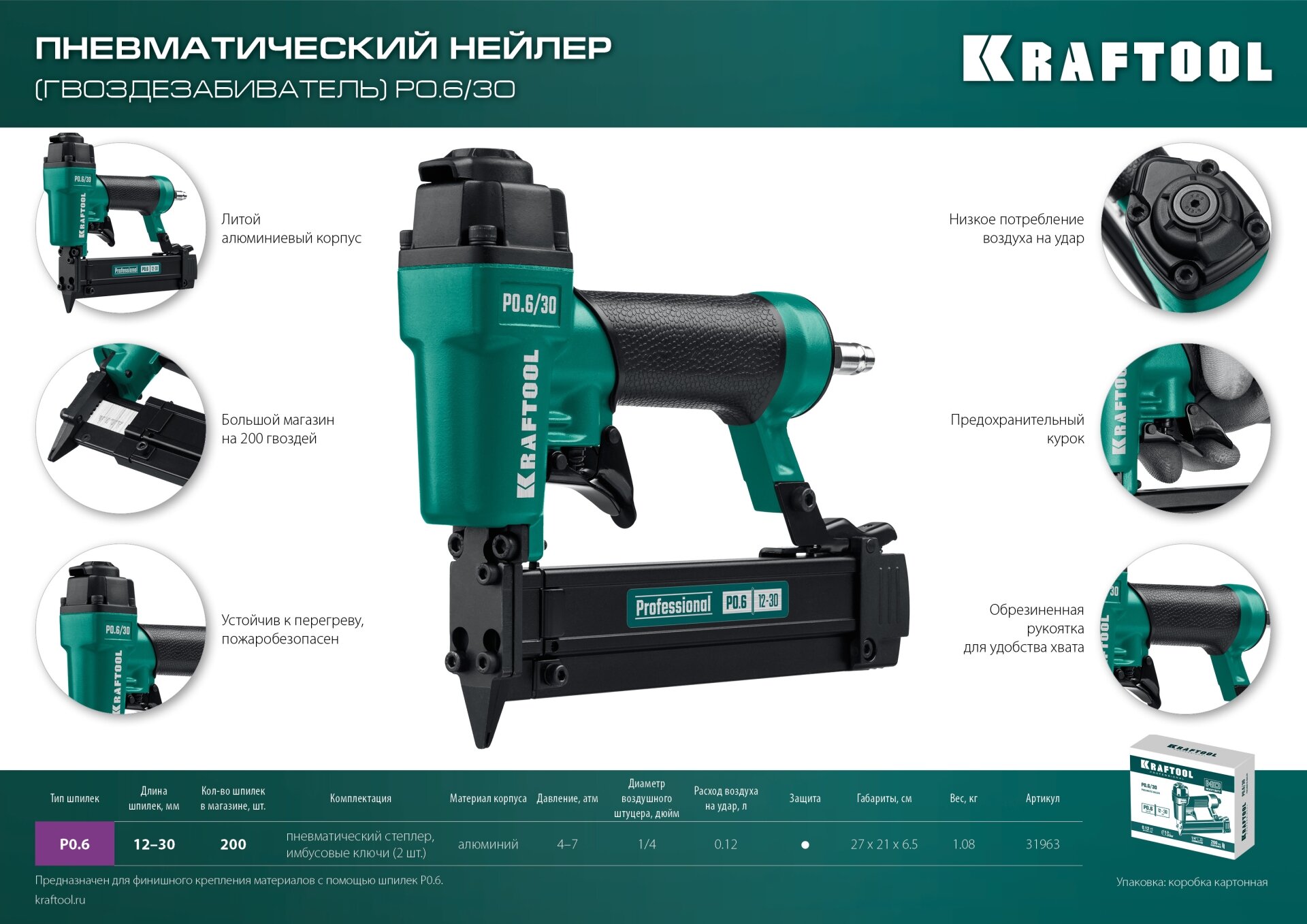 KRAFTOOL P0.6 (12 - 30 мм) пневматический нейлер (гвоздезабиватель), (31963)
