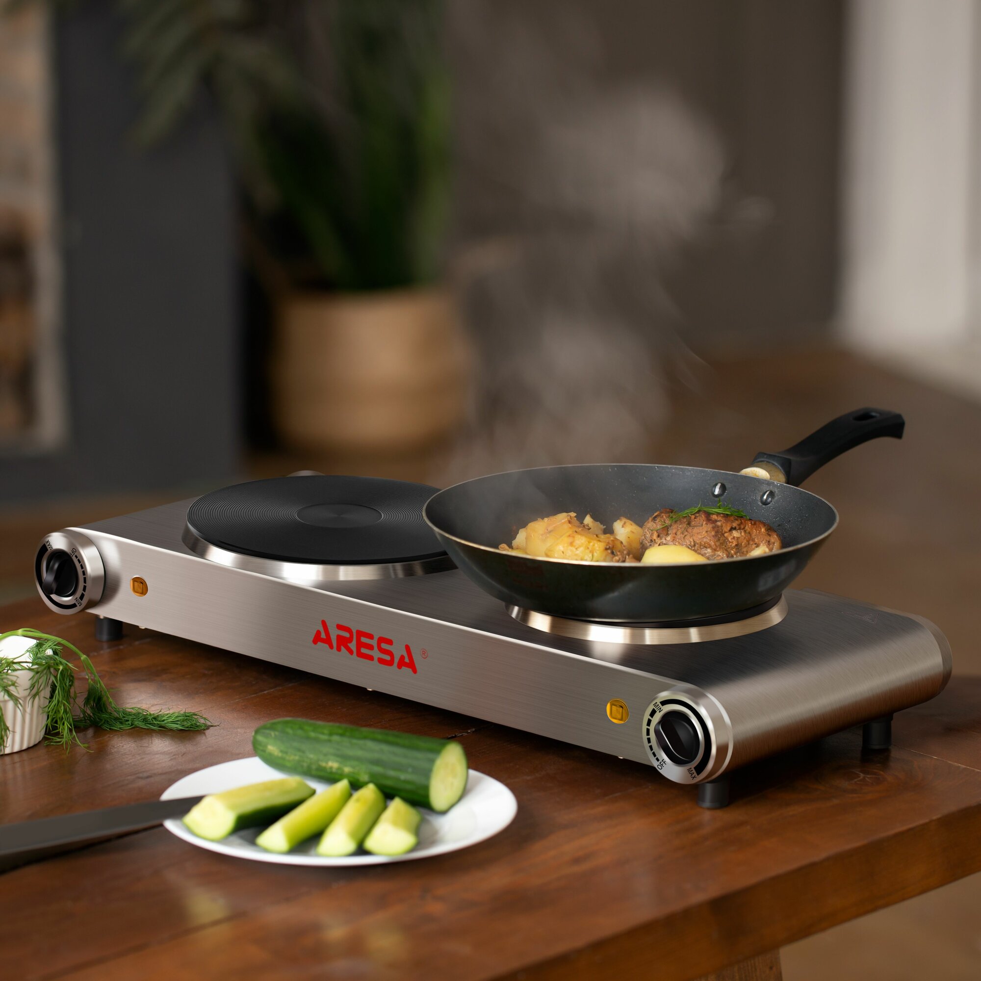 Плитка электрическая ARESA AR-4702, Чугунная рабочая поверхность, 2 конфорки диаметром 188 мм / 155 мм, 2230-2650 Вт, Регулировка температуры нагрева, шнур 1 м, Нескользящие ножки, Защита от перегрева, Световой индикатор