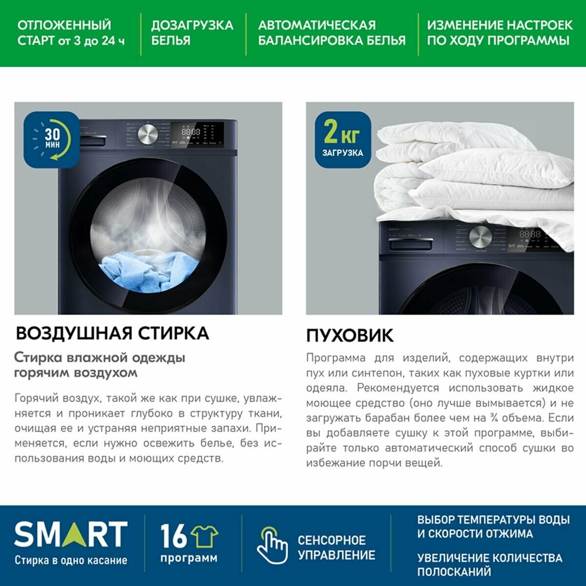 красивый дизайн стирает и сушит тихая подсветка автоматический выбор режимов |