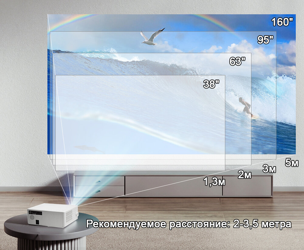 | Отзыв: | На фото картинка проецируется по диагонали из угла комнаты. Расстояние до экрана примерно 4.5 метра. Горит настольная лампа. |