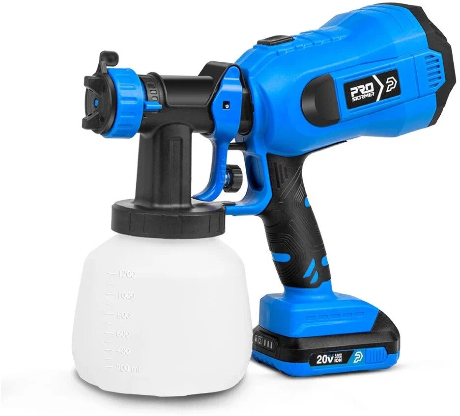 Аккумуляторный краскопульт Prostormer, 20В, объем бака 1,2 л, вязкось 30-50 DIN, PSDSG800