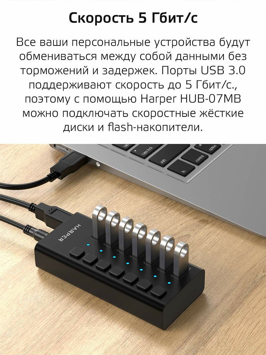 USB Концентратор HARPER HUB-07MB / 7 портов USB 3.0 / скорость передачи данных до 5 Гб / c, черный