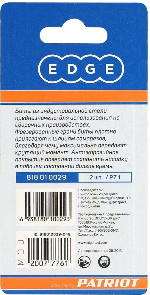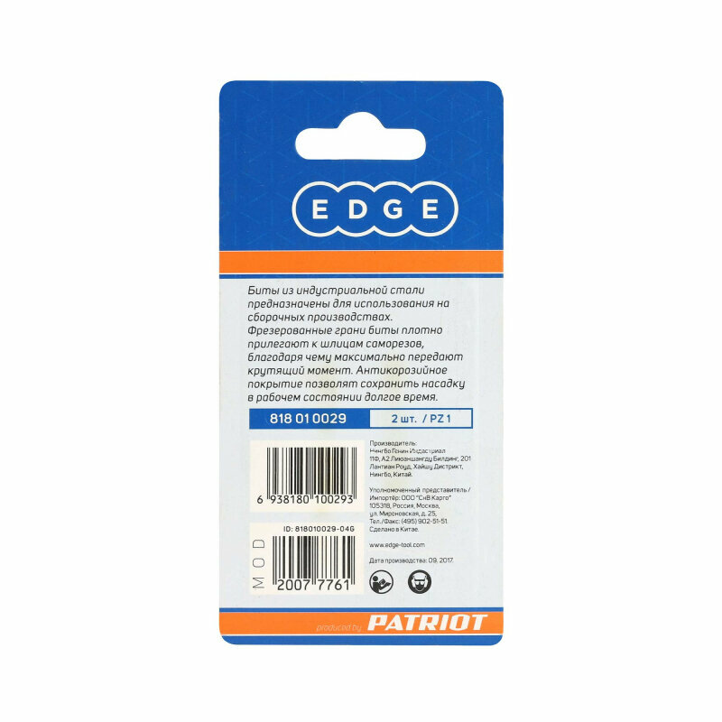 EDGE by PATRIOT Бита PZ1 длина 50 мм, 2шт в блистере 818010029 интересное: