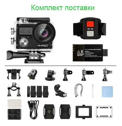 | Комплектация | - 1x AKASO Brave 4 Camera; - 1x Пульт управления; - 2x 1050 мАч аккумулятора; - 1x Влагозащитный чехол; - 1x Крепление для велосипеда; - 7x различных креплений; - 2x Фиксаторы; - 1x Крепление для шлема; - 1x Ремешок; - 5x Стяжки; - 1x Задняя защитная крышка; - 1x USB-C кабель; - 1x Quick Reference Guide. |