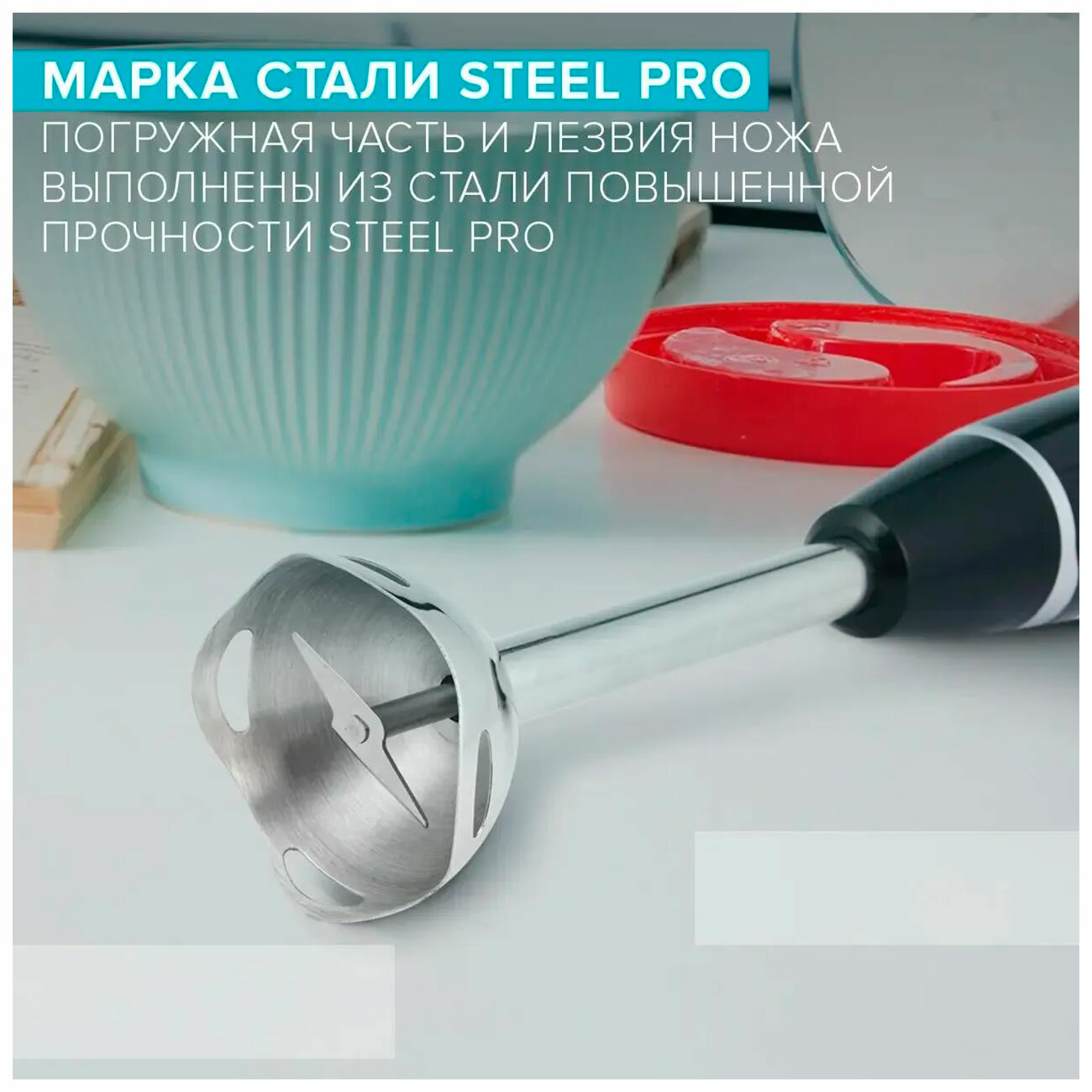Материал погружной части насадки-блендера: Нержавеющая сталь STEEL PRO