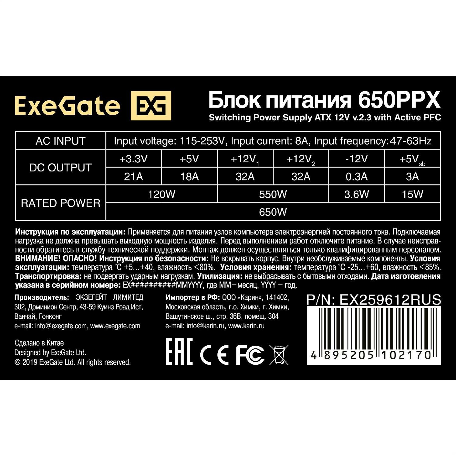 Купить ExeGate 650PPX 650W 80 Plus Black EX259612RUS-S