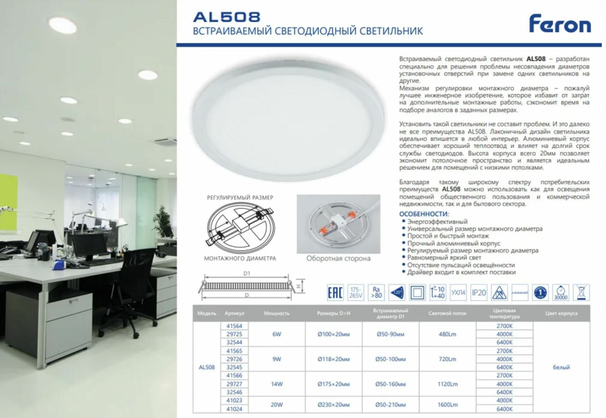 FERON Светильник встраиваемый светодиодный с диаметром до 210мм 20W 6400K,1600Lm, белый, AL508 41024 интересное: