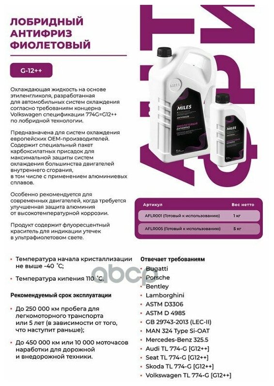 Ниже Вы можете прочитать отзывы на Антифриз Miles арт. AFLR001, ознакомится с подробными характеристиками, посмотреть интересные обзоры и фотографии на Антифриз Miles арт. AFLR001.
