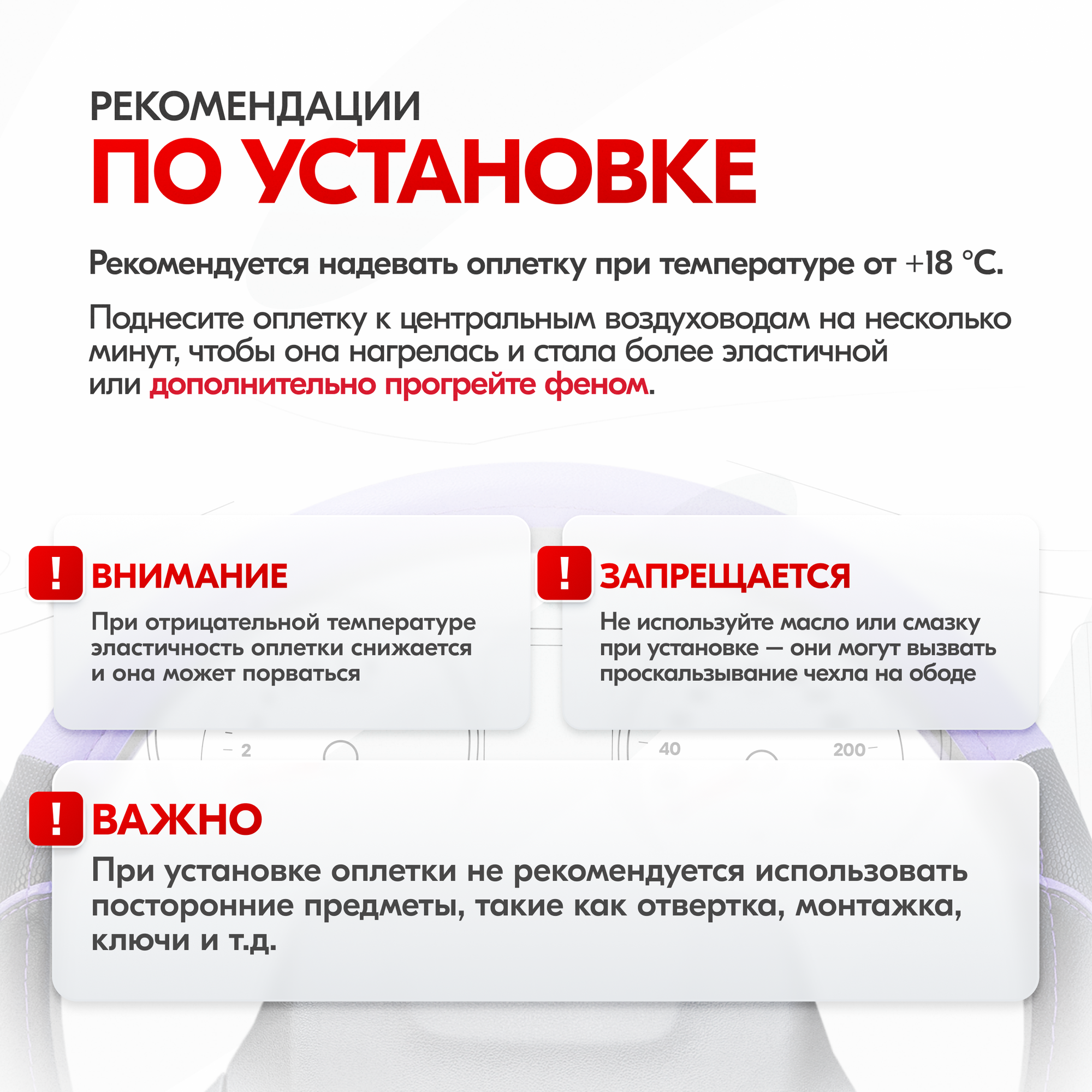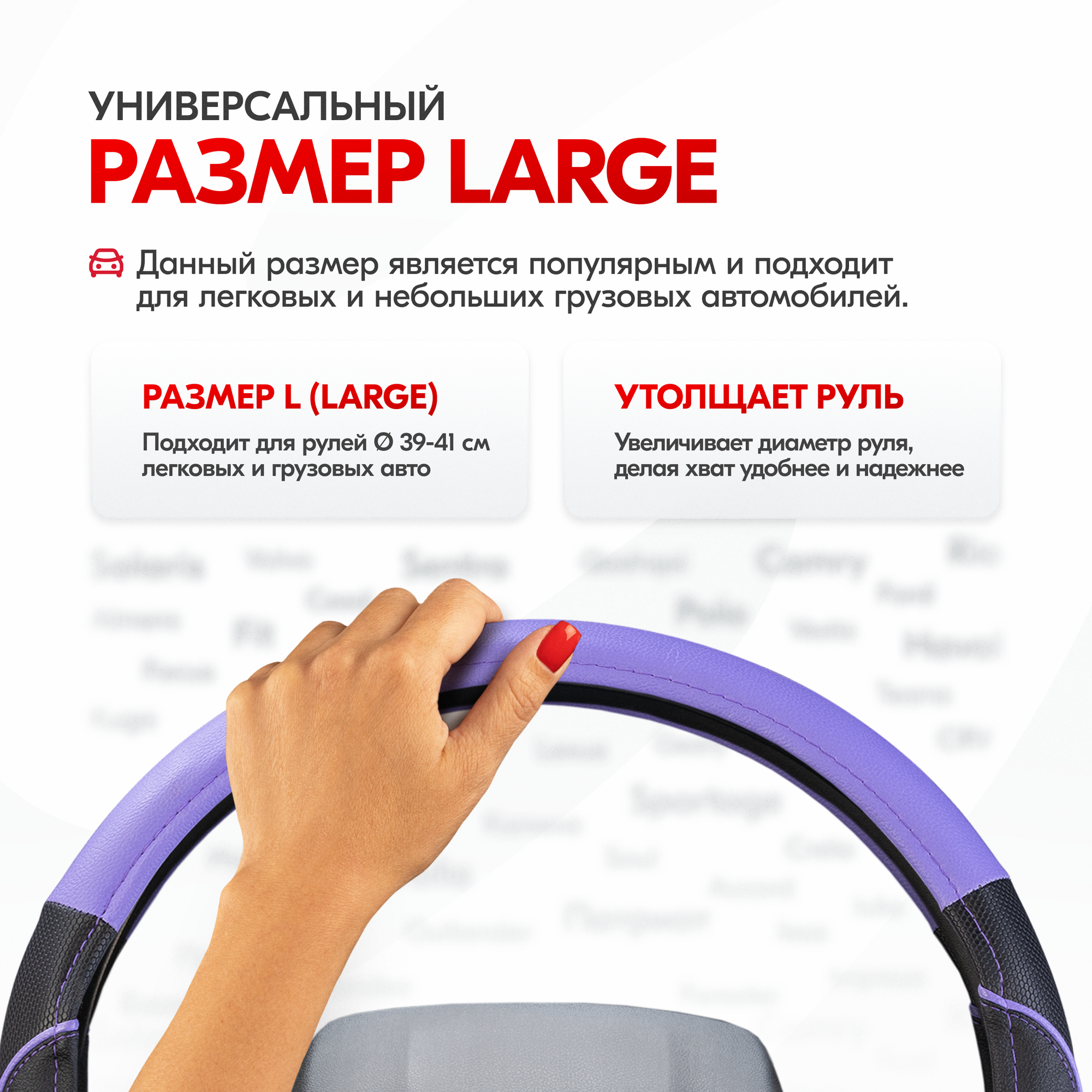 | Дополнительная информация | Рекомендации производителей: выбирайте оплётку под размер вашего рулевого колеса. Неверно выбранный размер может стать причиной проскальзывания оплётки или привести к невозможности снять или надеть её на руль. |