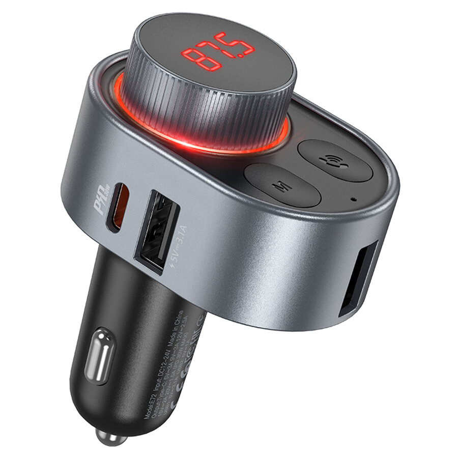 Автомобильное зарядное устройство с FM-Трансмиттер HOCO E72 Alegria, 2xUSB + 1xUSB-C, 3.1A, 30W, серый металлик