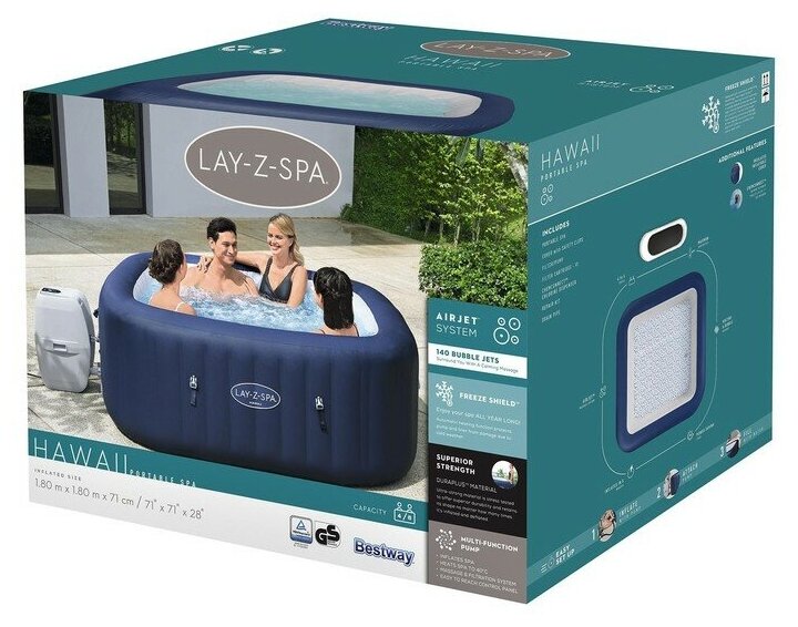 Ниже Вы можете прочитать отзывы на Надувной СПА-бассейн джакузи квадратный Bestway 60021 Lay-Z-Spa Hawaii AirJet (180х180х71 см, 4-6 человек, аэромассаж), ознакомится с подробными характеристиками, посмотреть интересные обзоры и фотографии на Надувной СПА-бассейн джакузи квадратный Bestway 60021 Lay-Z-Spa Hawaii AirJet (180х180х71 см, 4-6 человек, аэромассаж).