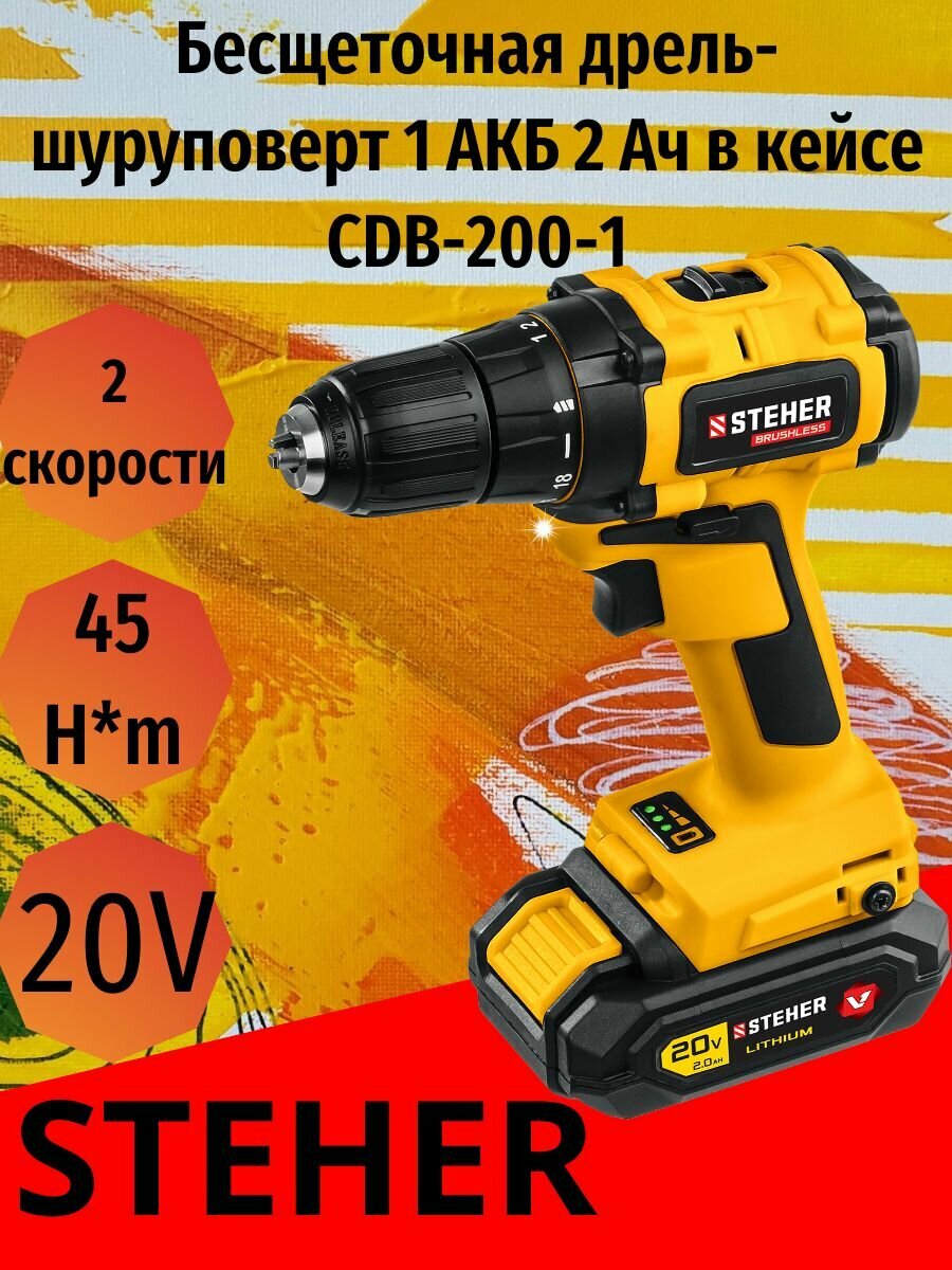 Бесщёточная дрель-шуруповерт STEHER 20В 1 АКБ 2Ач CDB-200-1