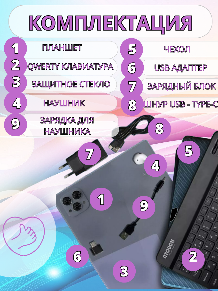 | Комплектация | Упаковка Планшет Android Зарядное устройство USB-кабель Type-C Наушник Bluetooth Чехол для клавиатуры Bluetooth Защитная пленка Руководство пользователя |