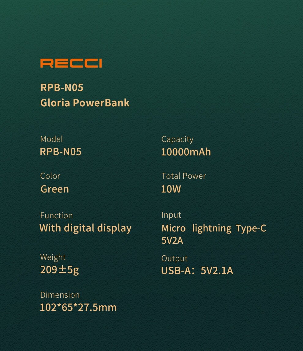 RECCI внешний аккумулятор GIORIA 10000mAh RPB-N05 Green интересное: