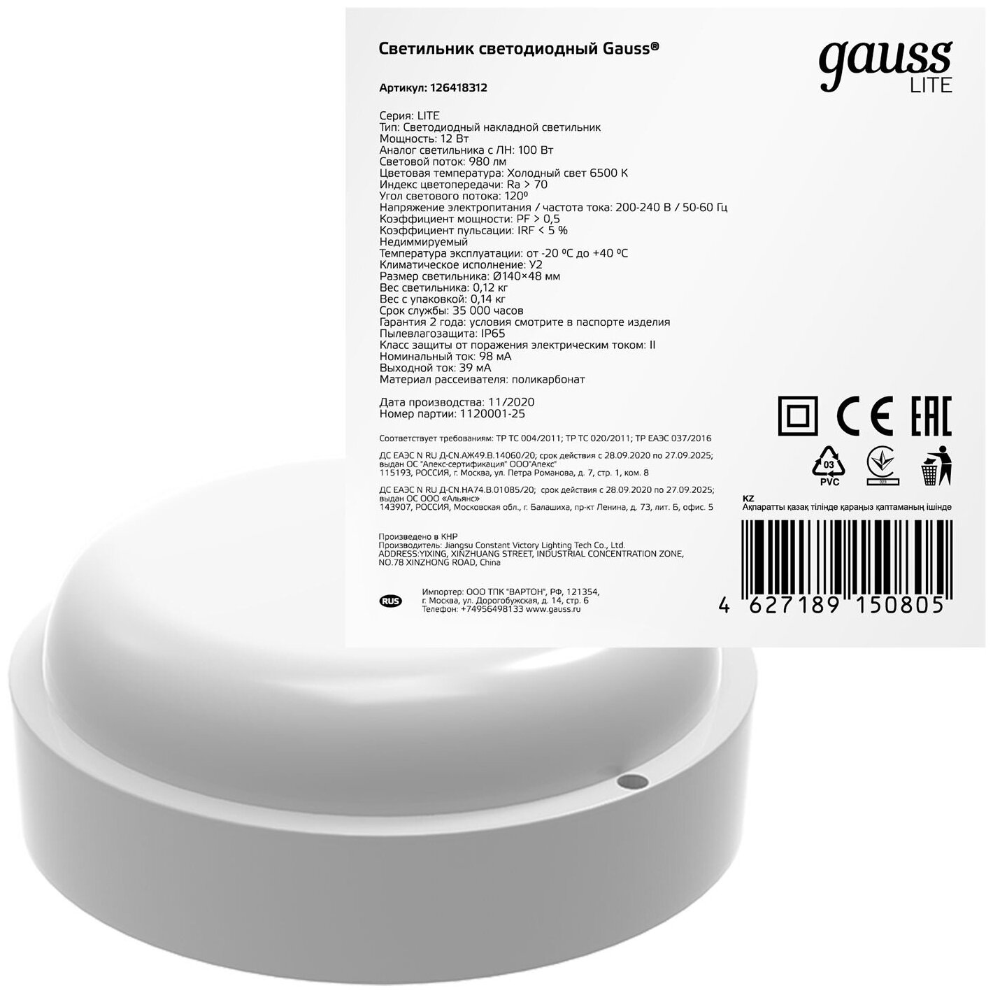 Купить Светильник ЖКХ Gauss LITE круг 12W 980lm 6500K 200-240V IP65 D140*48мм белый LED 1/40