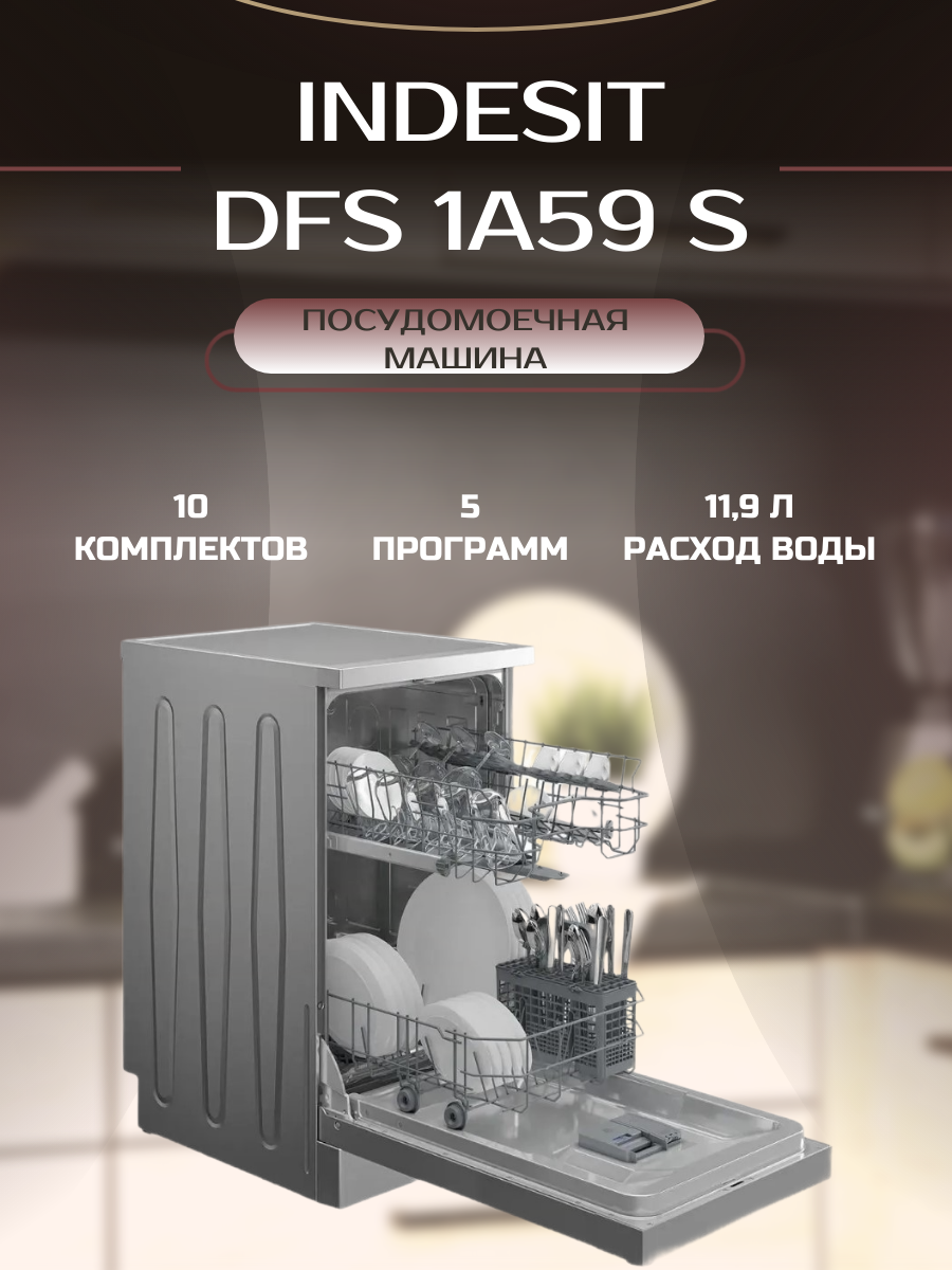 Посудомоечная машина Indesit DFS 1A59 S, полноразмерная, напольная, 44.8см, загрузка 10 комплектов, серая [869894100020]