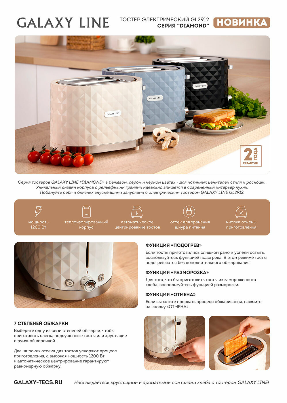Тостер GALAXY LINE FASHION SHOW GL2922, 900Вт, 2 отсека для тостов, термоизолированный