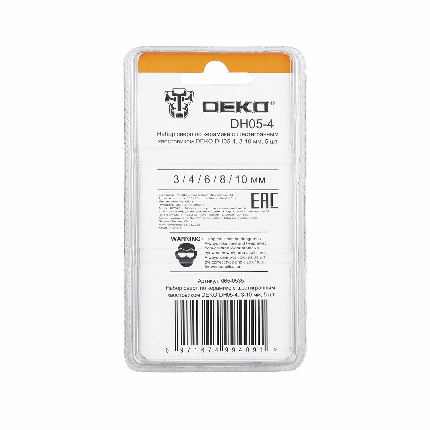 Набор сверл по керамике 3-10мм с шестигранным хвостовиком DEKO DH05-4, 065-0535, 5 шт