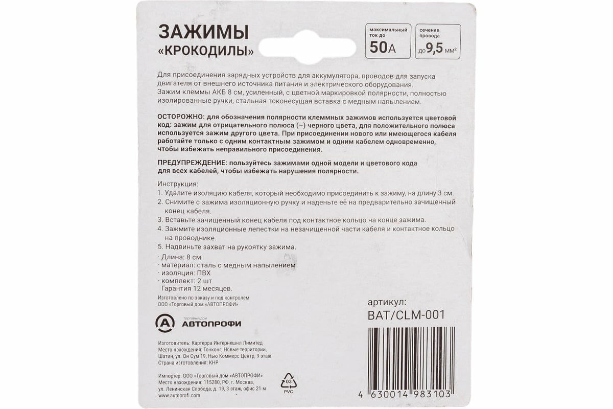 Купить Зажим клеммы АКБ AUTOPROFI BAT/CLM-001, 8см, с цвет. маркировкой полярности, резин. изоляция ручек, оцинк. сталь с медным напыл., 2шт.