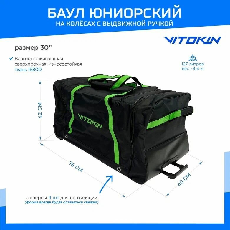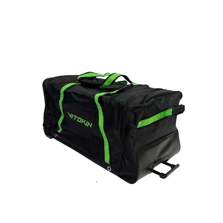 Купить Баул на колесах хоккейный с карманами и ручкой VITOKIN, размер 30" юниорский на колесах черный с зеленым