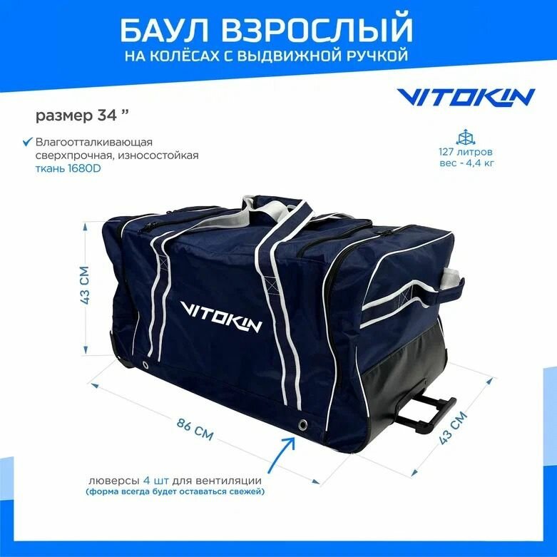 Купить Баул на колесах хоккейный с карманами и ручкой VITOKIN, размер 34" взрослый синий