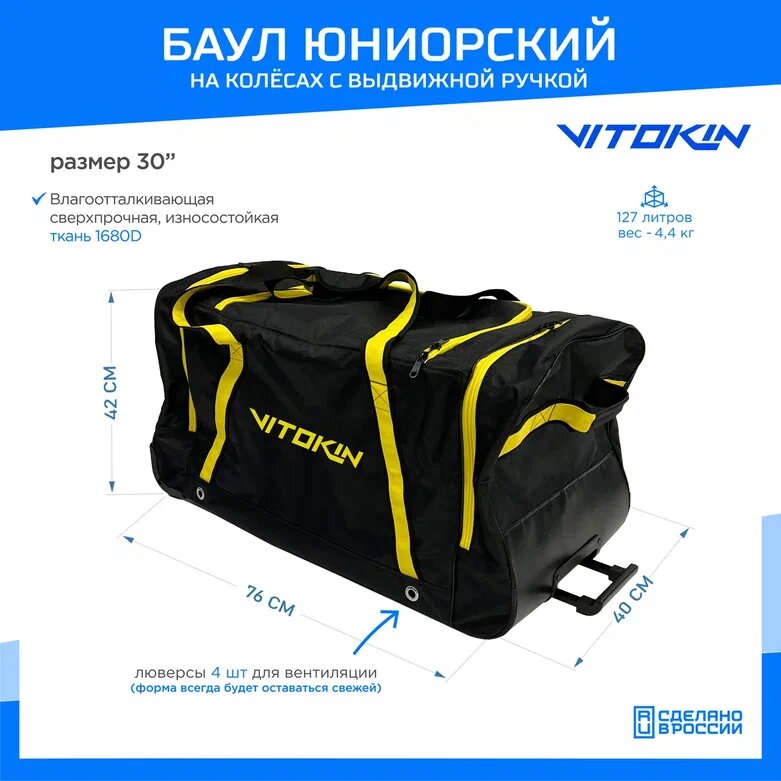 СохранитьБаул на колесах хоккейный с карманами и ручкой VITOKIN, размер 30" юниорский на колесах черный с желтым интересное: