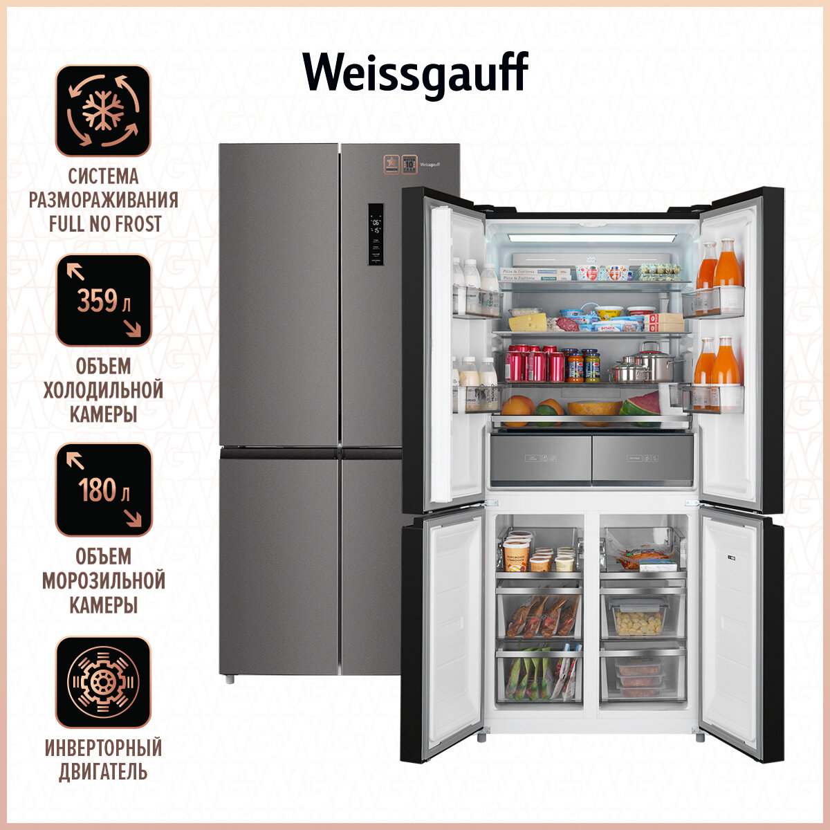 Отдельностоящий холодильник с инвертором Weissgauff WCD 590 Nofrost Inverter Premium Biofresh Dark Inox интересное: