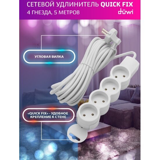 32011 3 Удлинитель бытовой, 4 гнезда, 5м, без заземления, с держателем, 2200Вт, 10А, белый, 32011 3, duwi, цена за 1 шт.
