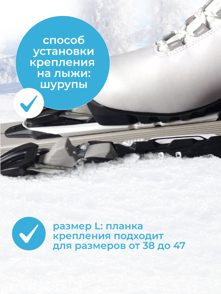 | Отзыв: | Стандартное крепление на лыжные ботинки системы NNN, в комплекте идут шурупы. Шурупы могут не подойти к определенным моделям лыж. Шурупы нужно сажать на клей. |