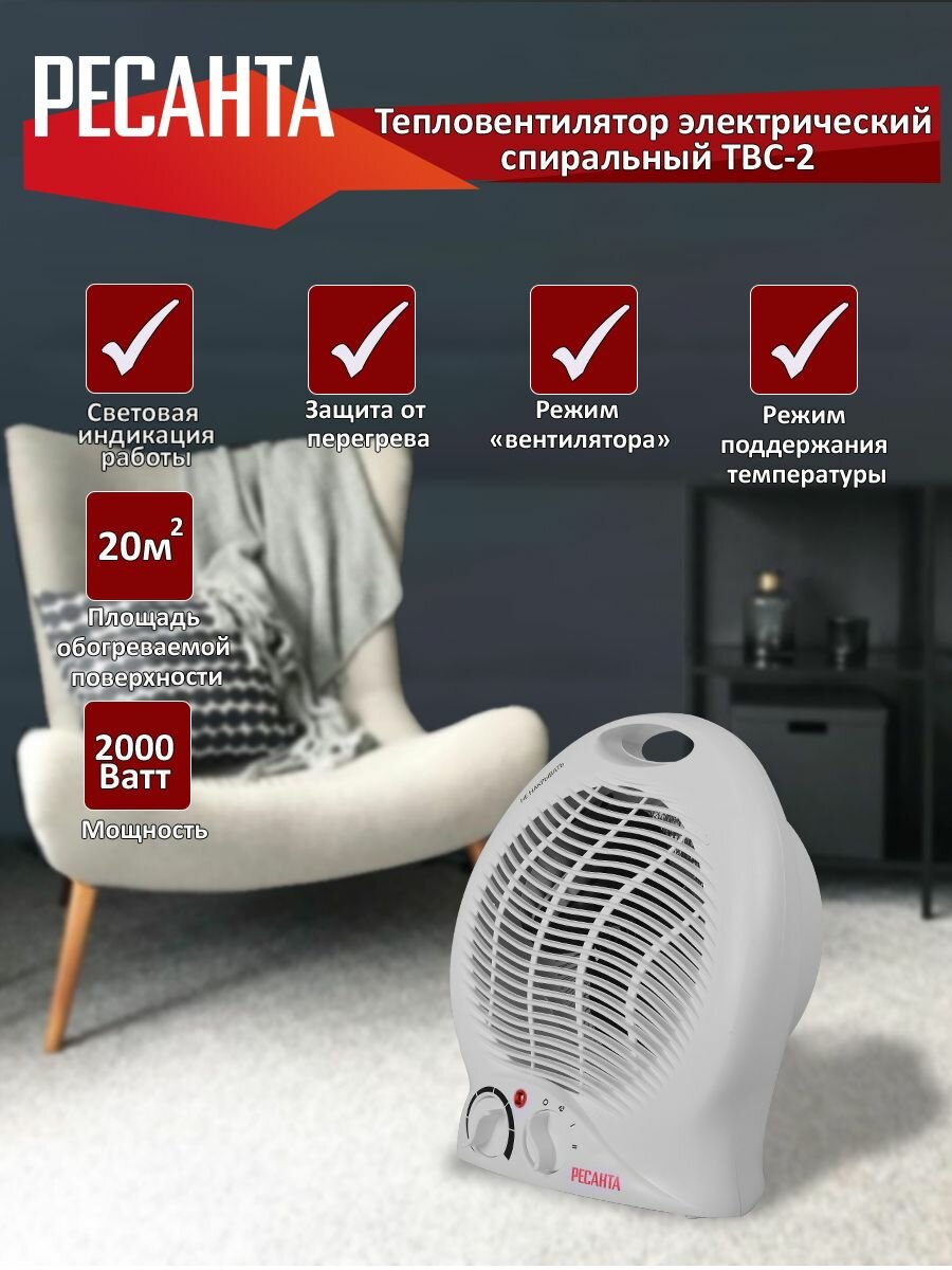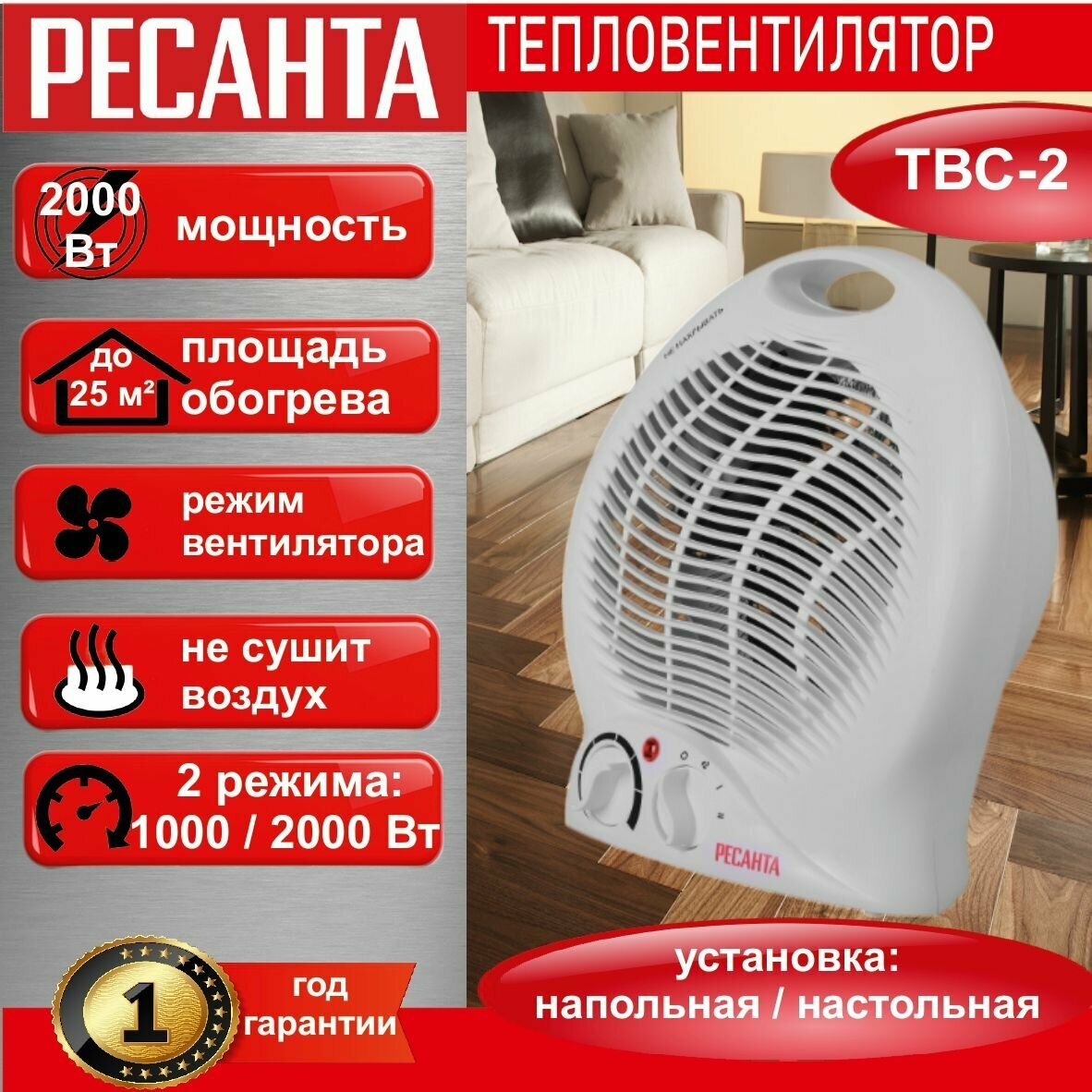 Тепловентилятор РЕСАНТА ТВC-2, 2 кВт, 20 м², белый