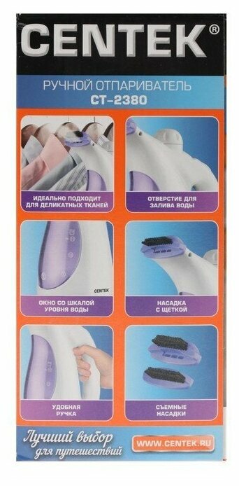 Centek Отпариватель Centek CT-2380, ручной, 800 Вт, 330 мл, 15 г/мин, шнур 2 м, бело-фиолетовый