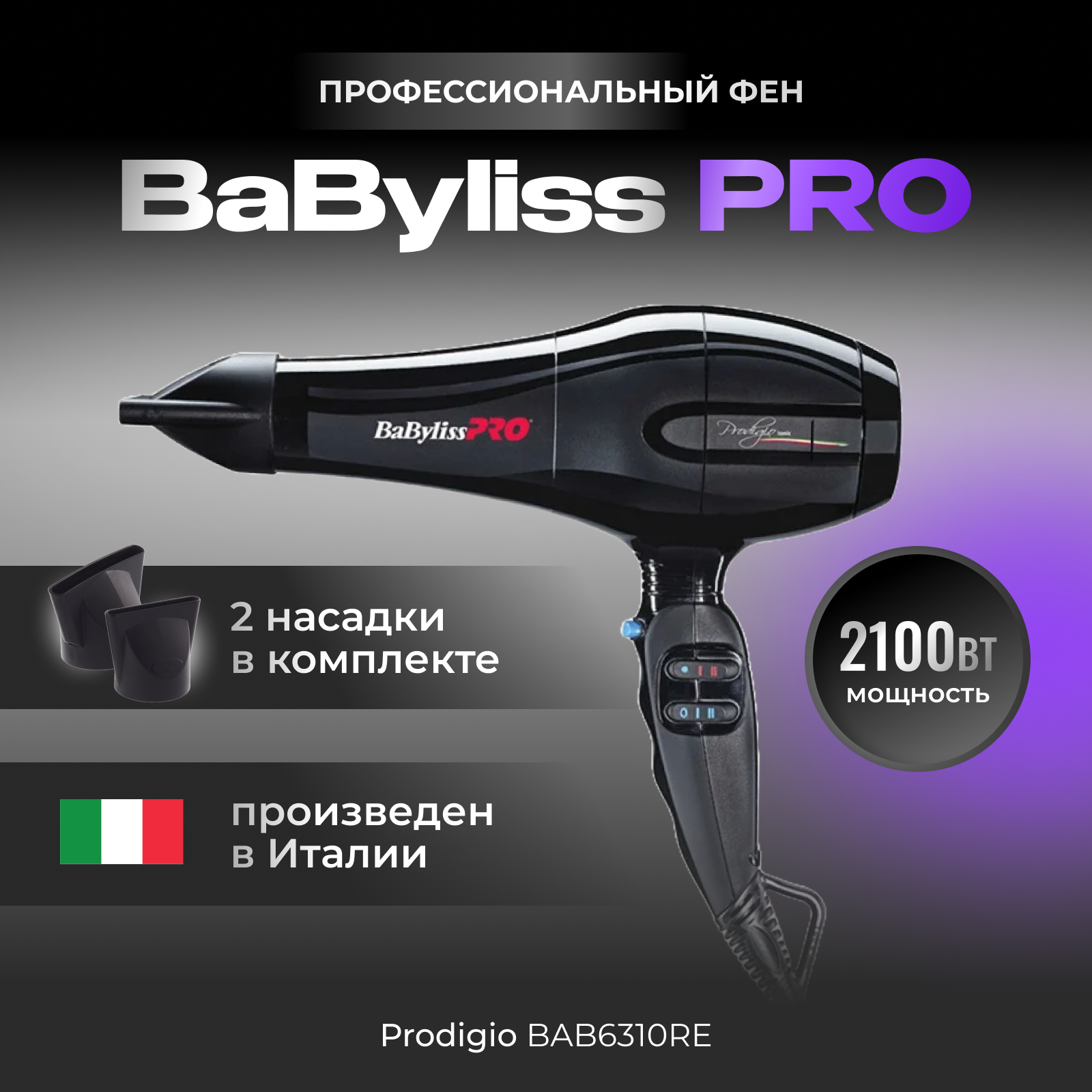 Фен BaByliss Pro Tiziano, 2100Вт, 2 насадки BaByliss MR-BAB6310E/6310RE