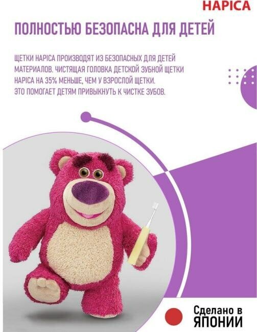 | Отзыв: | Нашему малышу 2 года и чистка зубов для нашей семьи это представление, к которому мы готовимся весь вечер. Купили Hapica Baby и стали чистить зубы играя - называем это "жужжит пчёлка - залетает в ротик" и ребёнок с удовольствием открывает рот. Сейчас у нас щётка для молочных зубов - мягкая и не травмирует ни эмаль, ни дёсна. |