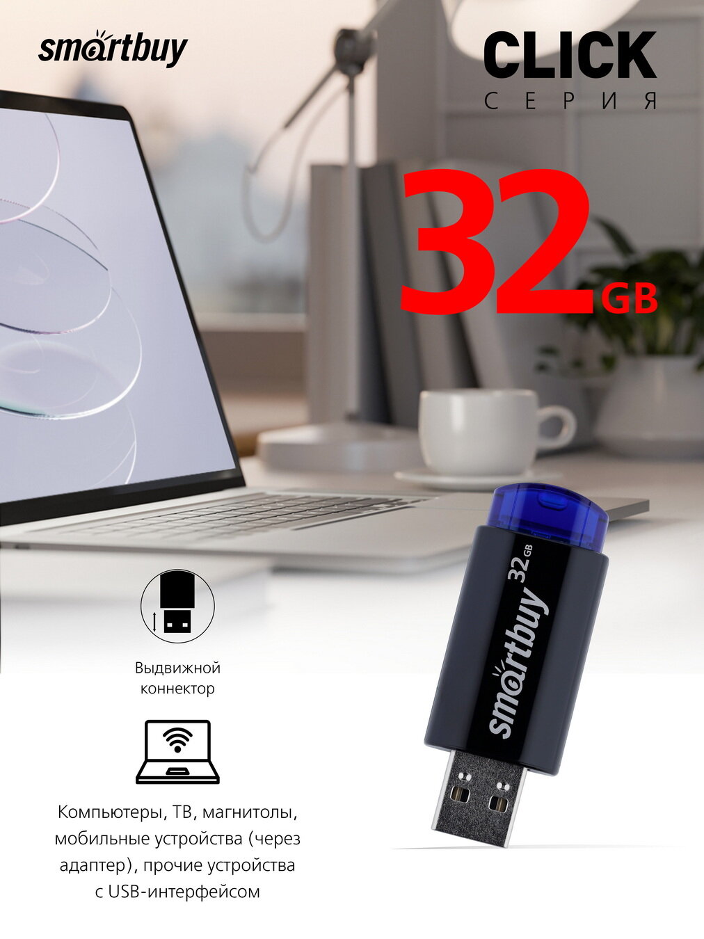 Флеш-карта SmartBuy Click, 32 Гб, USB 2.0, чтение до 25 Мб/с, черная