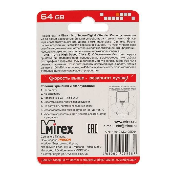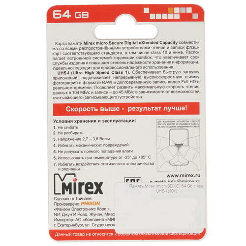 MicroSDXC 64Gb Mirex Class 10 Uhs-i (u1), 13612-MC10SD64, R104Mb/s, Без SD Адаптера, RTL .