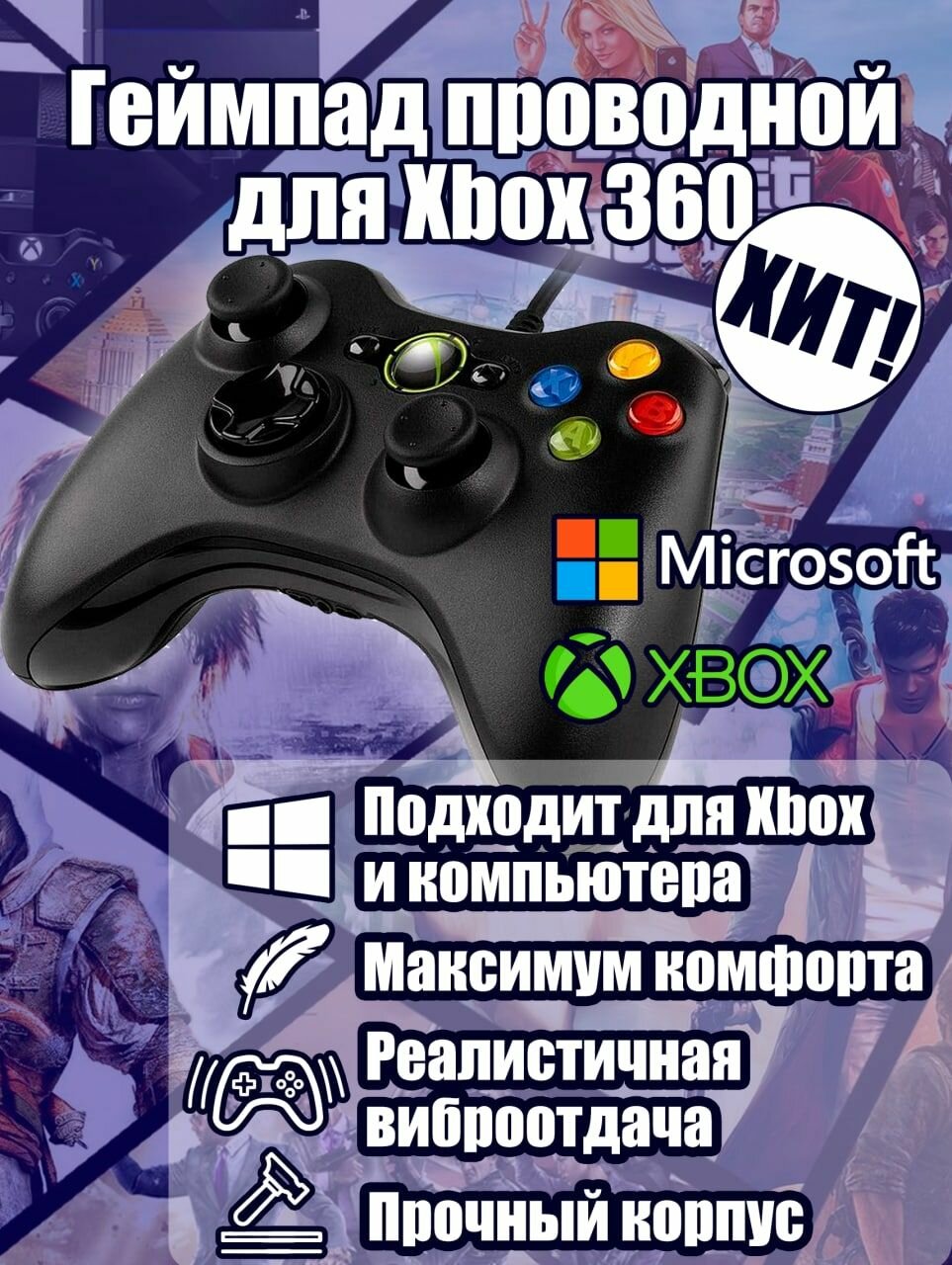- Длинный провод(2.7м) - Поддержка ПК на ОС Windows "из коробки".(Без установки драйверов) - Большинство игр, поддерживающие геймпад, используют библиотеки технологии XInput(Прямая совместимость с геймпадом XBox) - Аналоговые клавиши управления. - Вибрация |