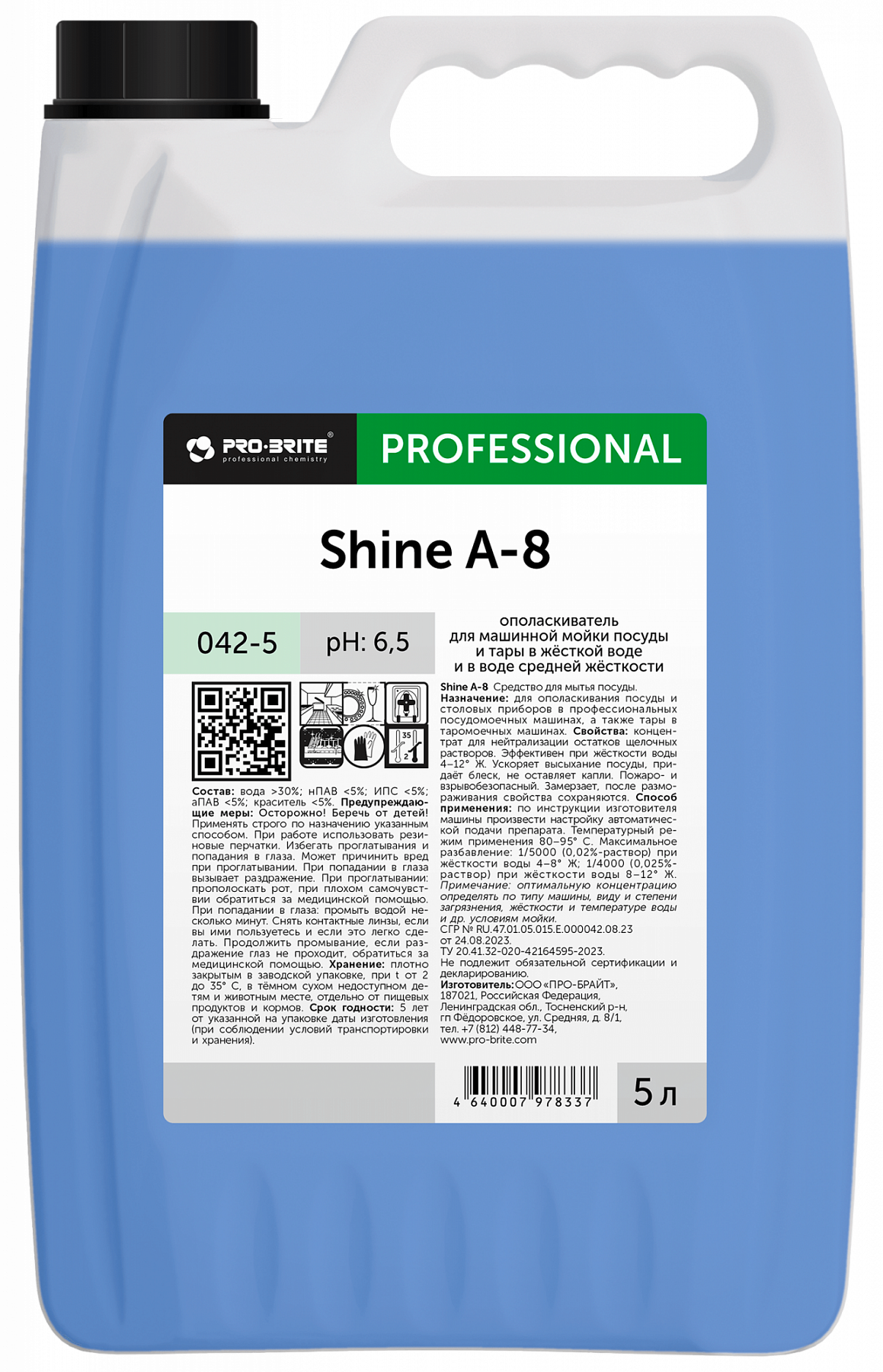 Ополаскиватель для посудомоечной машины Pro-Brite Shine А-8 ополаскиватель, 1 шт., 5 л