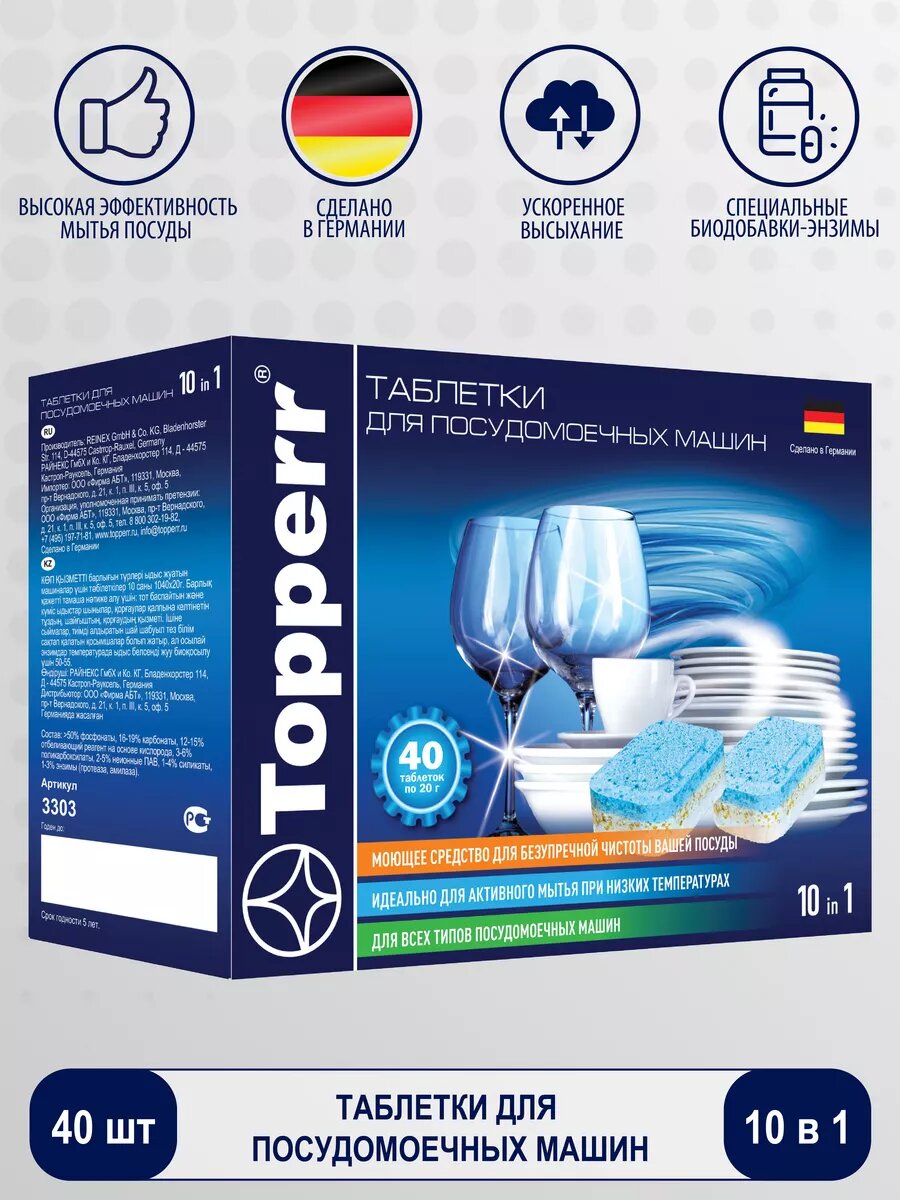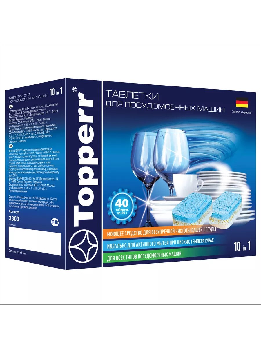 Таблетки для посудомоечной машины Topperr 10 в 1, 40 шт., 0.5 кг, коробка