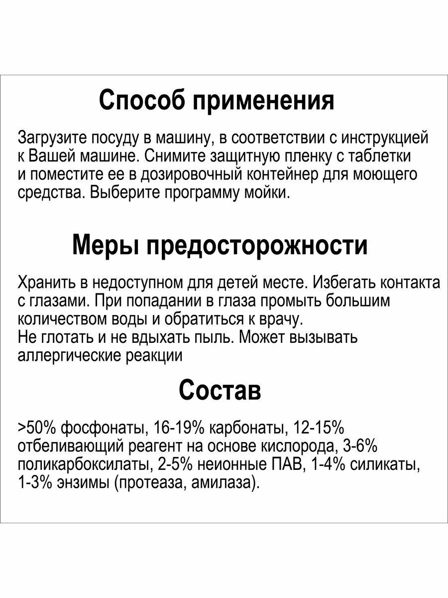 | Отзыв: | Неплохие таблетки для пмм, отмывают хорошо на долгом режиме. На режиме быстрой мойки остаются разводы. К минусам это не могу приписать, потому что в инструкции сказано что таблетка не всегда успевает раствориться за короткое время. Но и из этого нашла выход - для быстрого режима использую половину таблетки. Сравнивать пока не с чем, но за свою цену - вариант достойный |