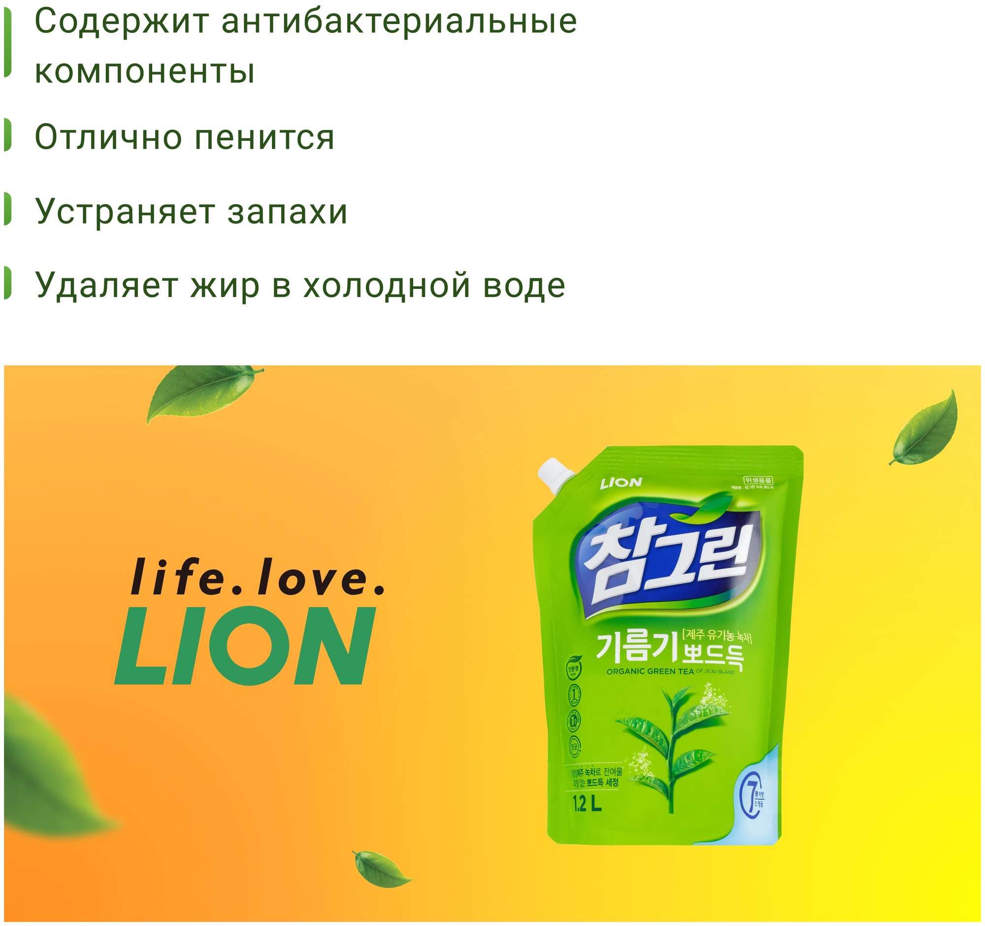 Средство для мытья посуды Lion Chamgreen Зеленый чай, мягкая упаковка с колпачком, 1.2 л