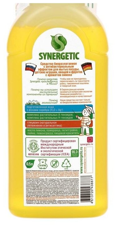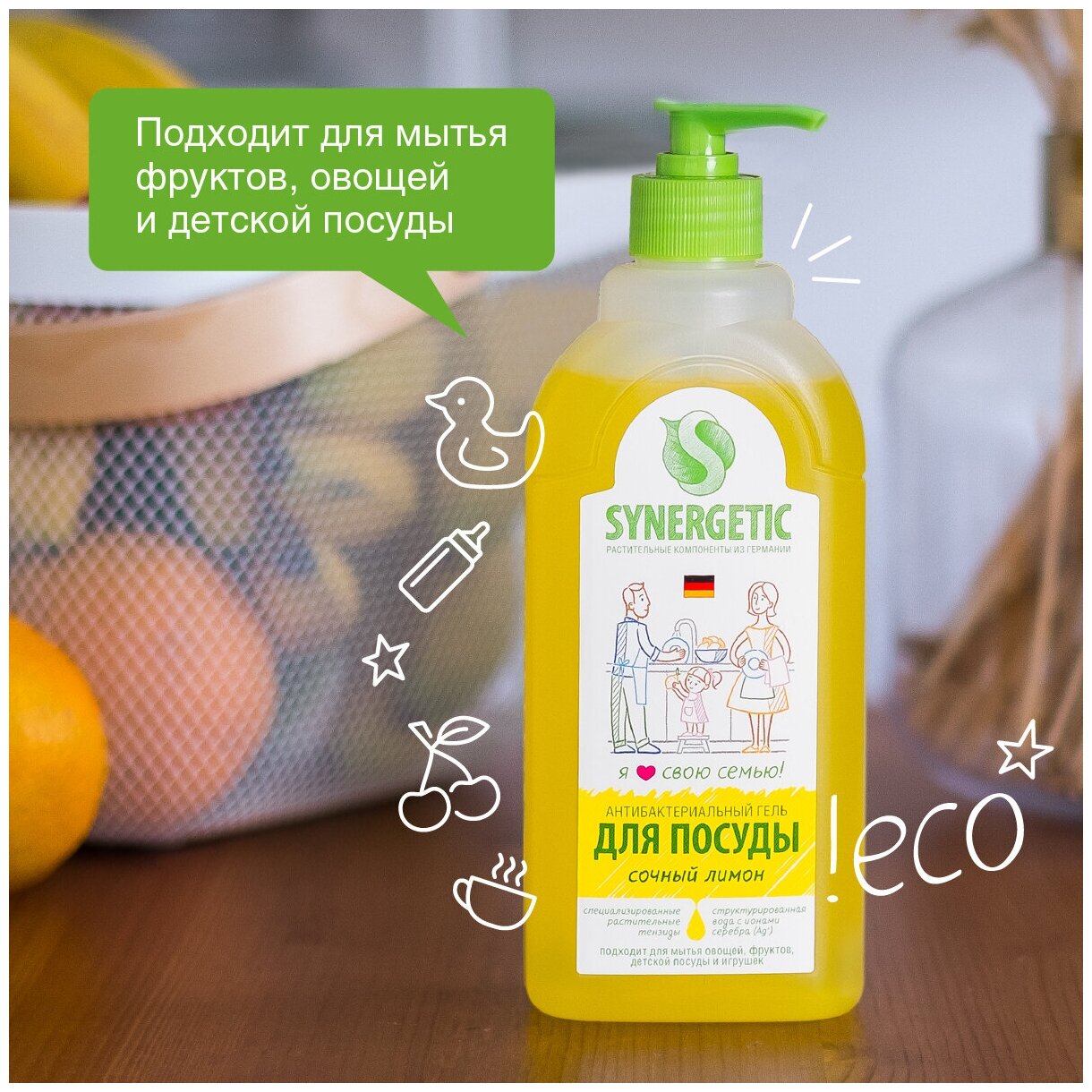 Средство для мытья посуды Synergetic "Лимон", с антибактериальным эффектом, 500 мл